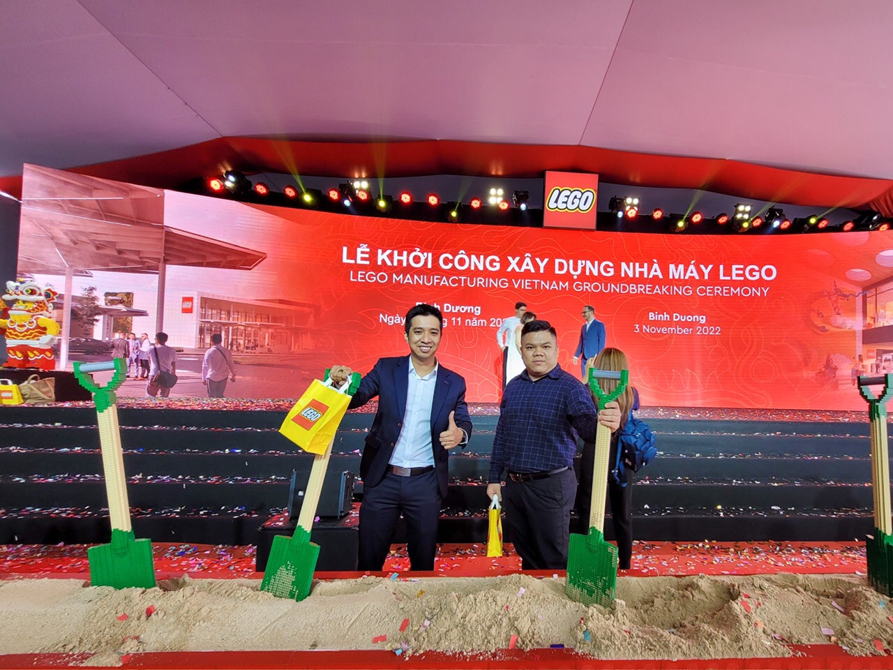 Đại diện We Love LEGO dự lễ khởi công nhà máy LEGO trị giá 1 tỷ đô tại VSIP 3, Bình Dương. Đây là nhà máy đầu tiên của LEGO được thiết kế thành cơ sở trung hòa carbon. Ngoài các tấm pin năng lượng mặt trời trên mái, nhà máy còn có một trang trại điện mặt trời được xây dựng trên khu đất lân cận, đáp ứng tổng nhu cầu sử dụng năng lượng hằng năm. Nhà máy cũng sử dụng các thiết bị sản xuất tiết kiệm năng lượng hiện đại và được xây dựng đáp ứng mức tiêu chuẩn tối thiểu của LEED Gold – chứng chỉ công trình xây dựng xanh được công nhận trên toàn cầu. LEGO dự kiến hoạt động sản xuất sẽ bắt đầu vào năm 2024.